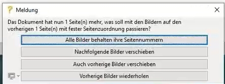 In manchen Textvorlagen werden Bilder fest auf bestimmten Seiten eingefügt. Wenn ein Textdokument durch Einfügen/Entfernen von Umbrüchen oder Seiten mehr oder weniger Seiten als die Vorlage hat, erscheint ein Warnhinweis mit Abfrage. Die Bilder können wahlweise entfernt, wiederholt oder verschoben werden, damit Bild und Text wieder zusammenpassen.