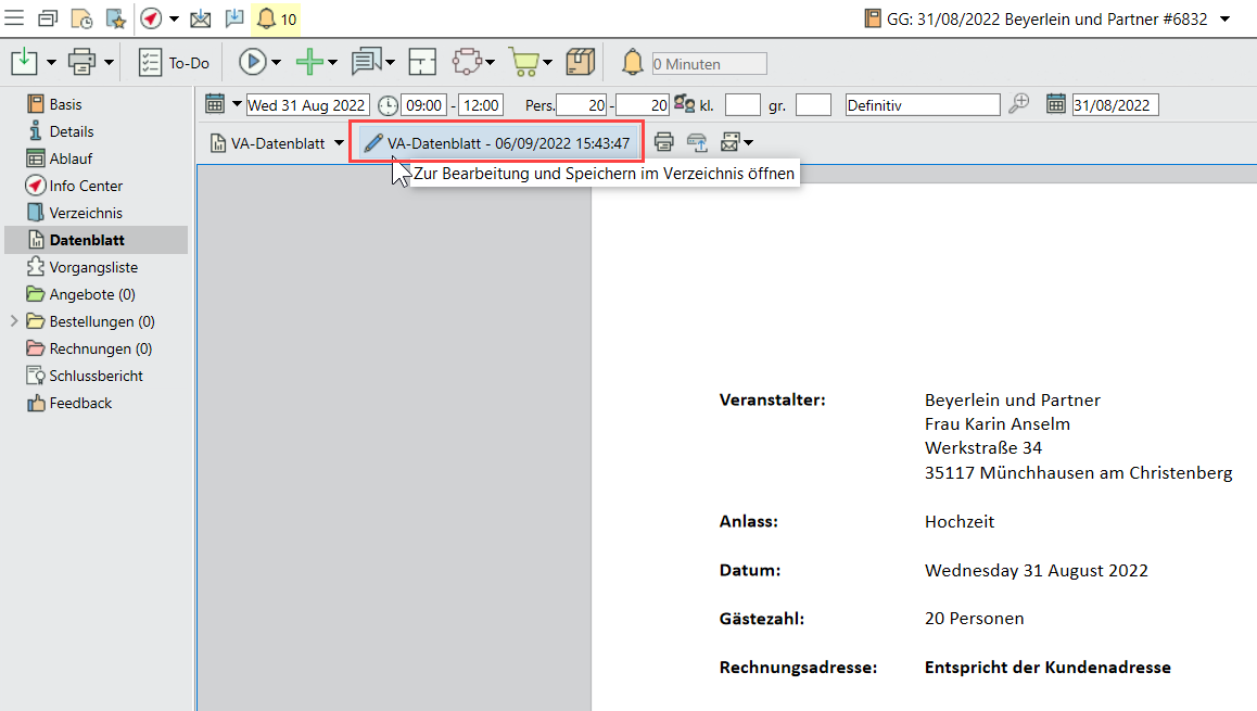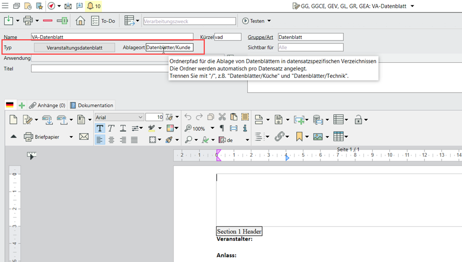Um Datenblätter bearbeiten und intern ablegen zu können, öffnen Sie ein Datenblatt, klicken Sie auf Bearbeiten und speichern und speichern Sie das Datenblatt im Verzeichnis des geöffneten Datensatzes. Verzeichnisse sind für die Datensätze Adresse, Artikel, Veranstaltung und Projekt möglich. Der Ablageort kann in der Datenblattvorlage auch direkt vorbelegt werden. sollte die Ordnerstruktur noch nicht angelegt sein, so wird diese beim ersten Speichern automatisch erzeugt. Es können beliebige weitere Objekte hinzugefügt werden.