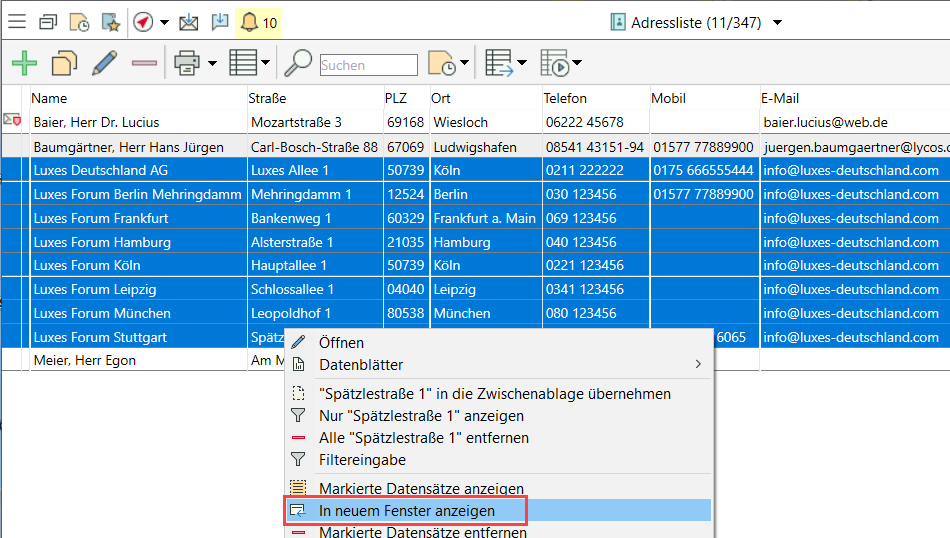 Markieren Sie einen Teil der Datensätze in einer Liste und lassen Sie ihn sich über Kontextmenü (Rechtsklick) "In neuem Fenster anzeigen", um schrittweise mehrere Gruppen von Datensätzen zu bearbeiten.