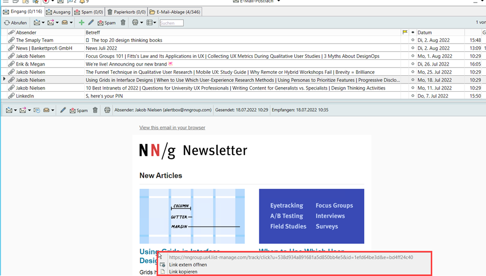 Bei Klick auf einen externen Link in einer E-Mail wird nun ein Kontextmenü mit Anzeige des vollständigen Links und weiteren Auswahlmöglichkeiten geöffnet.