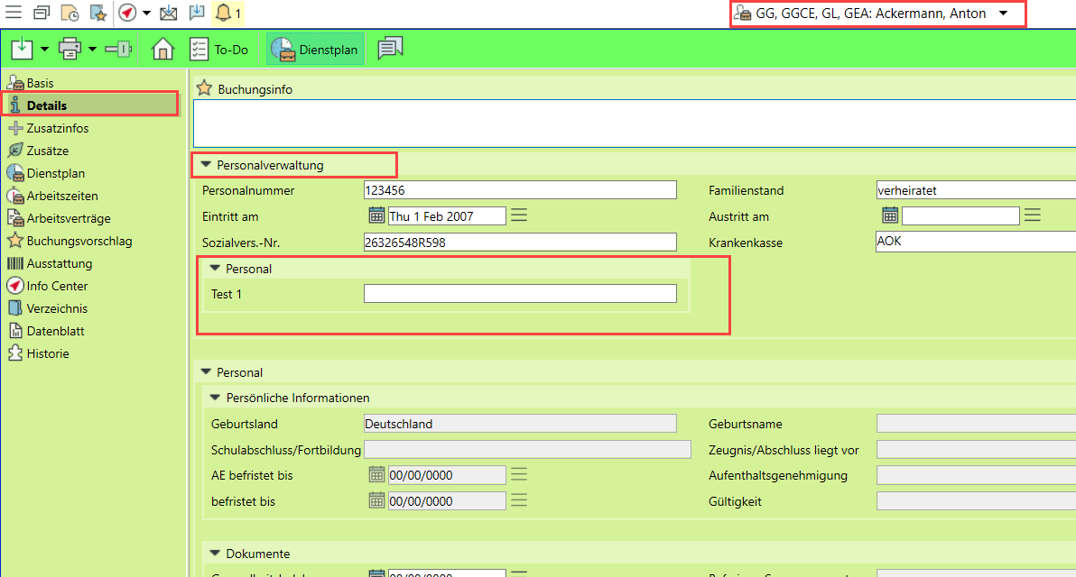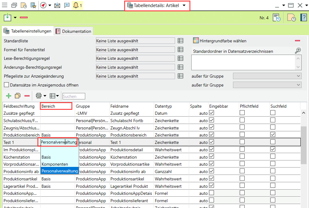 Neuer Anzeigebereich für Detailfelder unter Artikel > Personalverwaltung