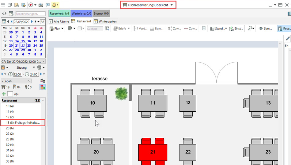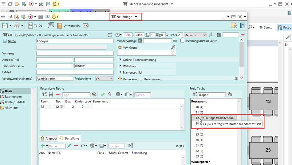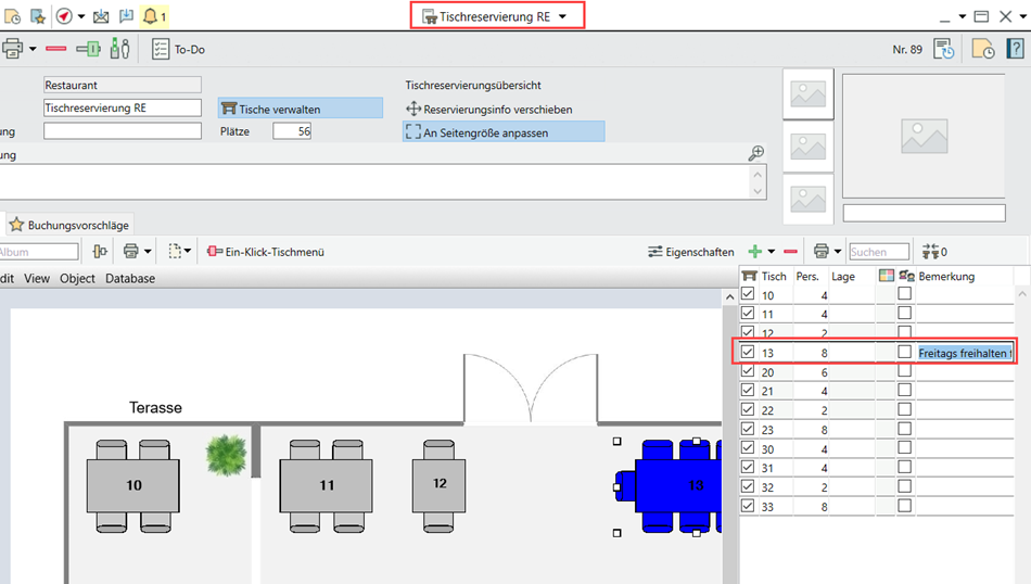 Geben Sie im Tischplan Bemerkungen zu einzelnen Tischen ein, die dann sowohl in der Tischreservierungsübersicht als auch in der Liste der freien Tische in den einzelnen Reservierungen angezeigt wird.