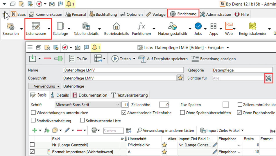 Neben dem Feld Sichtbar für klicken Sie auf das Administrator-Icon, um Listen und Vorlagen zu markieren, die dem normalen Benutzer nicht angeboten werden sollen. Dies bietet sich an für Listen und Vorlagen, die nur innerhalb einer Konfiguration in ihrem Verwendungskontext Sinn haben.