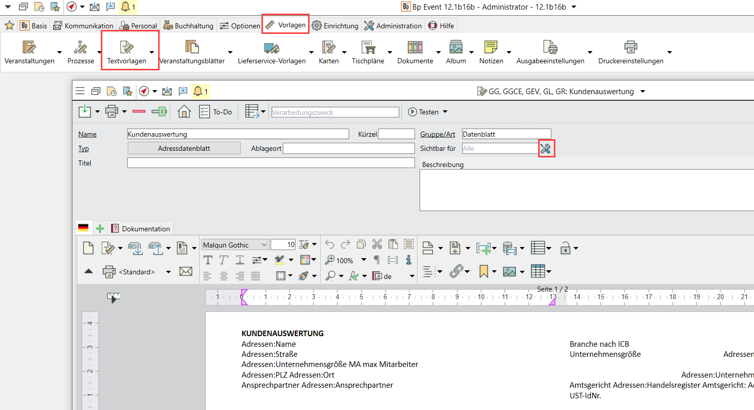 Beschränken Sie die Anzeige von bestimmten Listen oder Textvorlagen auf die Bereiche Vorlagen, Einrichtung und Administration.