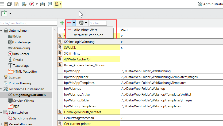 2. Veraltete und folglich ungültige Variablen ohne Auswirkung in der eingesetzten Version sind gelb markiert und leicht aufzuräumen. Über das Aufklappdreieck am Löschen-Icon können alle Variablen ohne Wert bzw. veraltete Variablen auf einen Schlag gelöscht werden.