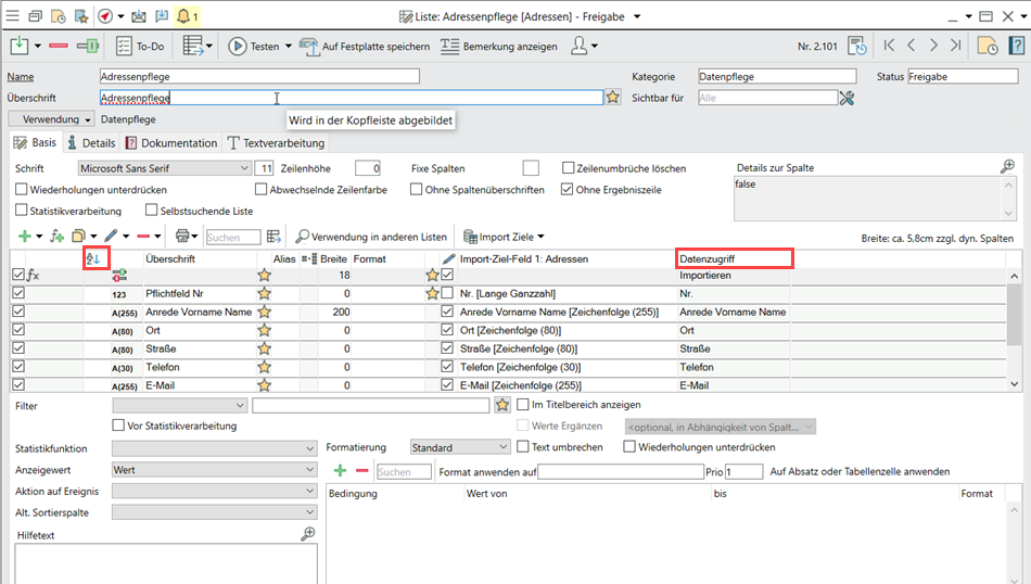 4. Die vormals "Felder" benannte Spalte heißt nun "Datenzugriff" und wurde ganz nach hinten verschoben.