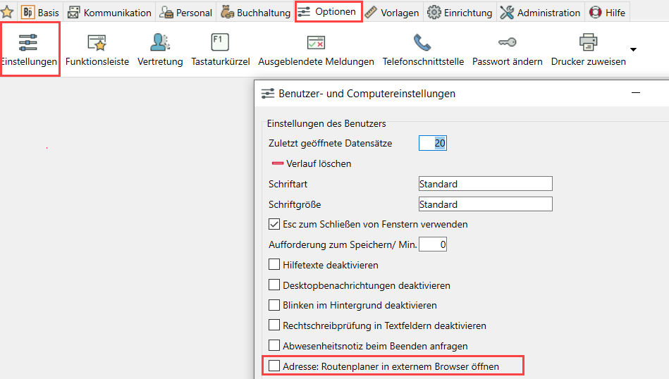 Legen Sie unter Optionen > Einstellungen fest, dass der Routenplaner aus Bp Event direkt in einem externen Browserfenster geöffnet wird, um dort dann alle von Google bereitgestellten Funktionen (z.B. Routenplanung an eigenes Smartphone senden) nutzen zu können.