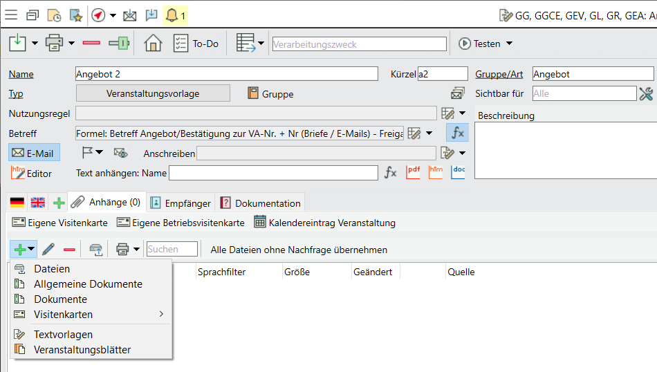 Textvorlagen mit vorbelegten Anschreiben, Anhängen und Empfängern