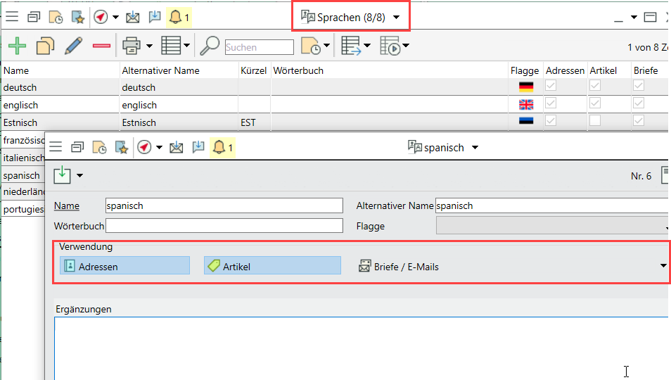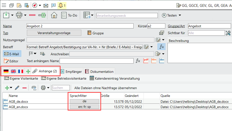 Weisen Sie mit dem Modul Mehrsprachigkeit in Artikeln, Briefen und Textvorlagen beliebig viele Übersetzungen zu. Für E-Mails können auch Anschreiben und Anhänge definiert werden.