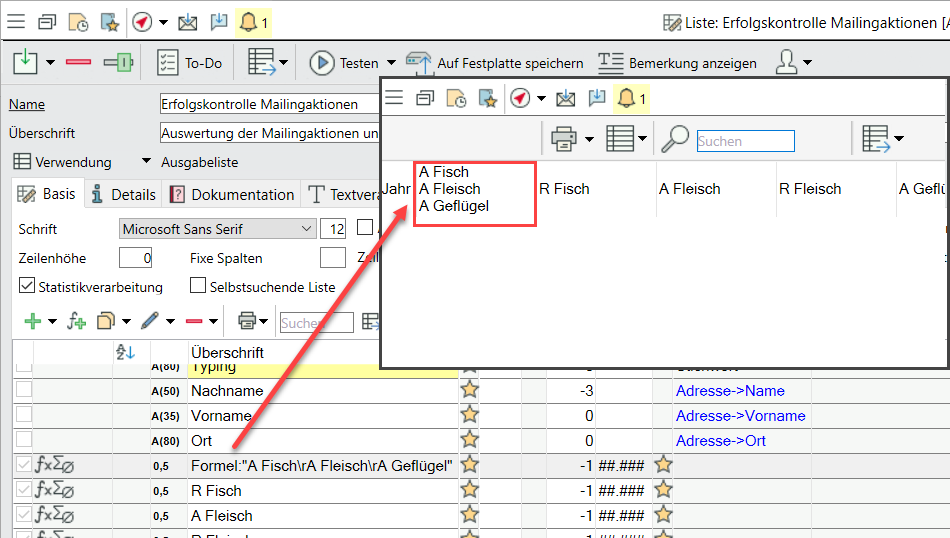 Formatieren Sie die Überschriften von Spalten im Listenwesen mehrzeilig, indem Sie die Zeilen mit \r trennen.