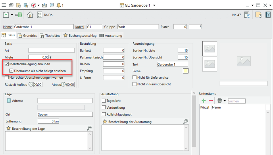 Um die ungewollte Reservierung aller verknüpften Oberräume zu verhindern, wählen Sie in den Einstellungen zum Unterraum "Oberräume nicht als belegt anzeigen"