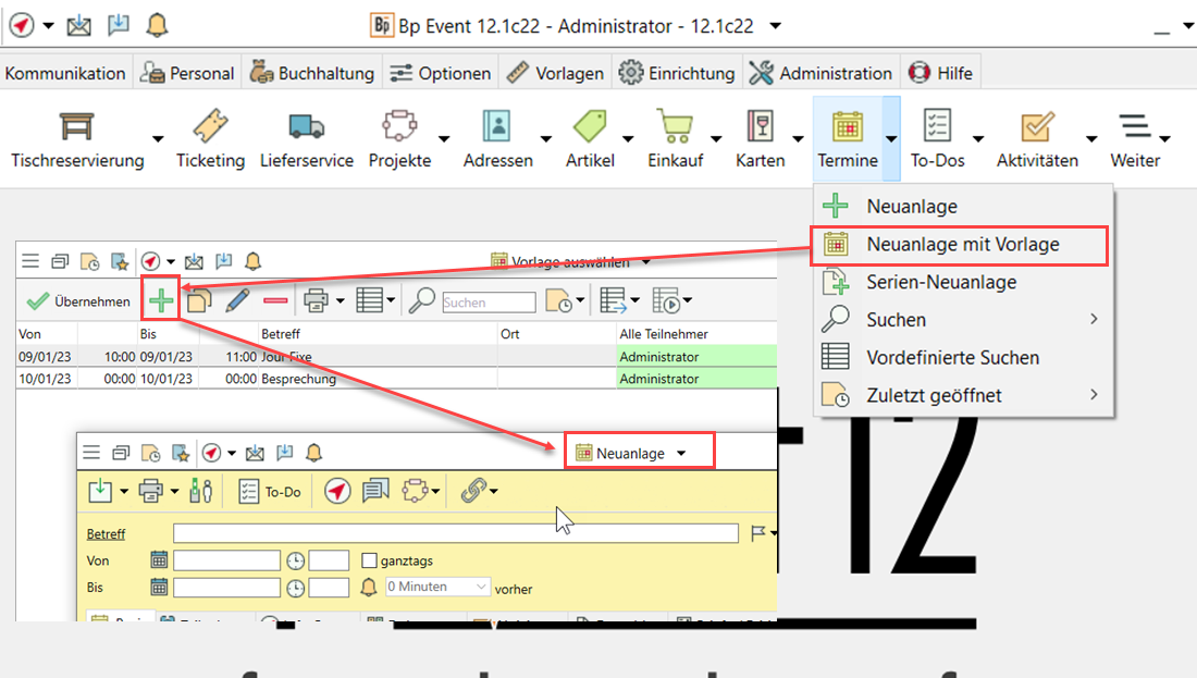 Wählen Sie in der Funktionsleiste Termine > Neuanlage mit Vorlage > Neu und belegen Sie alle Felder, die Sie in die Vorlage übernehmen möchten (Uhrzeit, Ort, Teilnehmern etc.).
