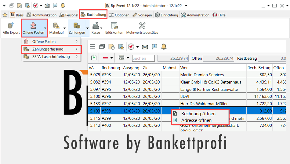 Öffnen Sie mit Rechtsklick (Kontextmenü) auf einen Datensatz direkt die verknüpfte Adresse oder Rechnung zu einer Zahlung.