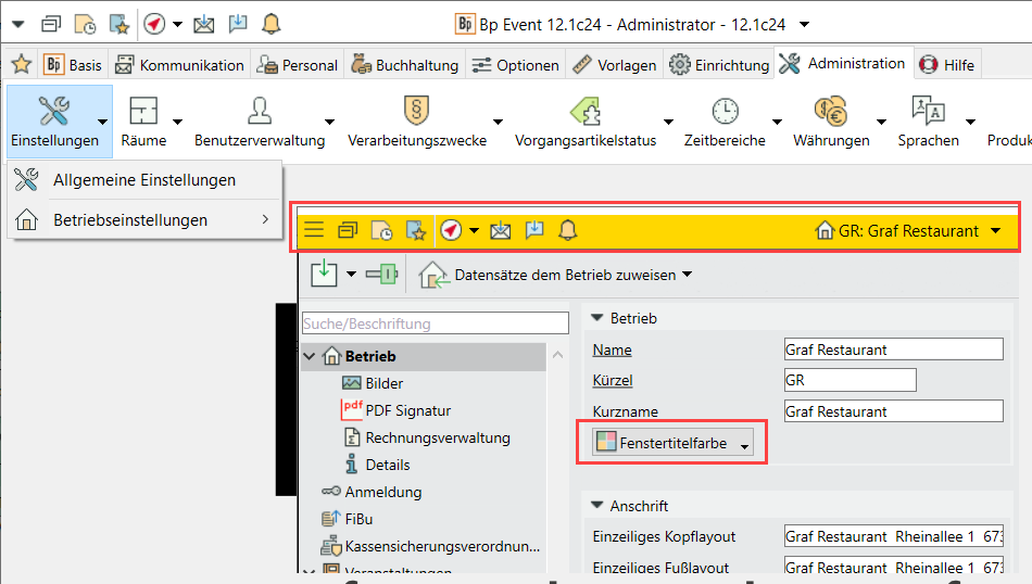 Wählen Sie unter Administration > Betriebseinstellungen > Betrieb eine Farbe für die Fenstertitelleiste zu. Alle Datensätze, die zu diesem Betrieb gehören, haben dann diese Hintergrundfarbe im Fenstertitel.