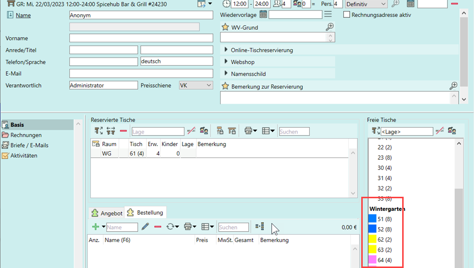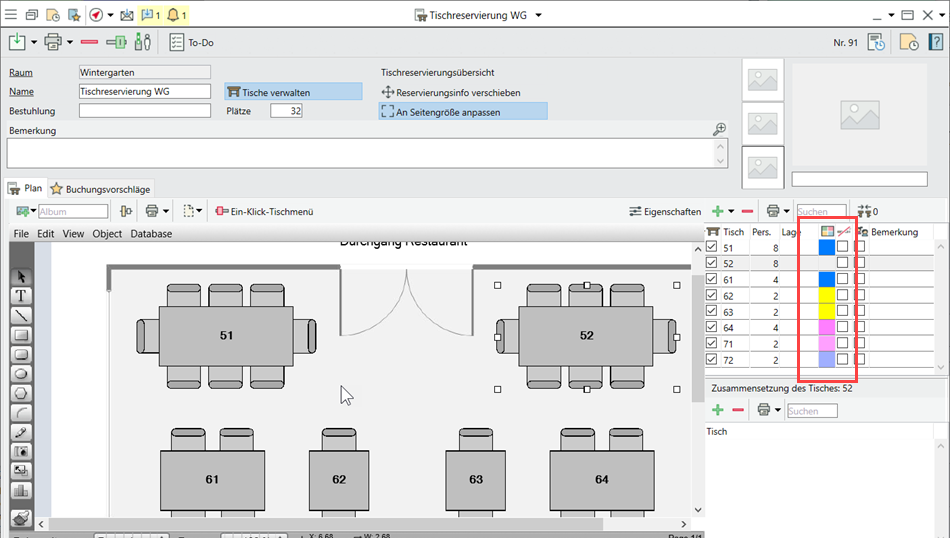 Wählen Sie im Tischplan für einzelne Tische über Rechtsklick in die Spalte Farbe individuelle Farben aus, um z.B. Tischgruppen oder Lagen deutlicher hervorzuheben. Die Farben werden in der Tischliste der Reservierungsübersicht sowie in den einzelnen Reservierungen wiedergegeben.
