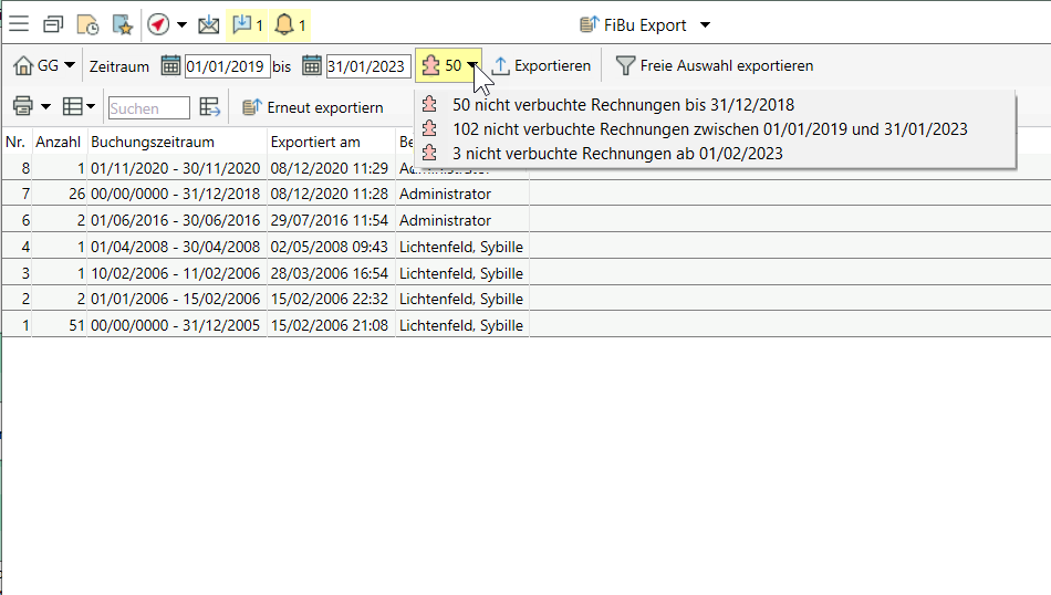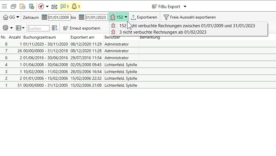Beim FiBu-Export wird jetzt deutlicher darauf hingewiesen, wie viele Rechnungen vor, während oder nach dem gewählten Exportzeitraum noch nicht verbucht sind.