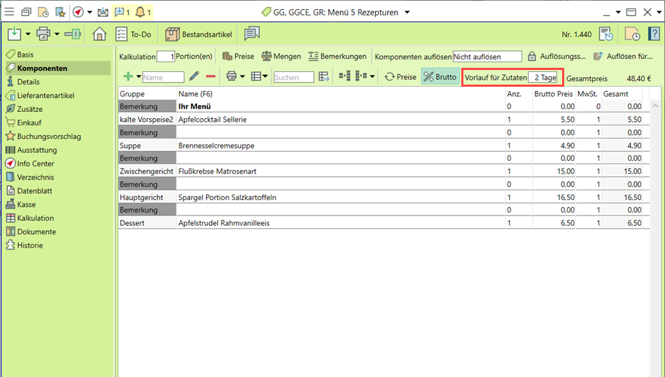Im Rezepturartikel gibt es dafür ein neues Eingabefeld, in dem z.B. 7 Tage Vorlauf für die Zubereitung eines Sauerbratens eingegeben werden kann.