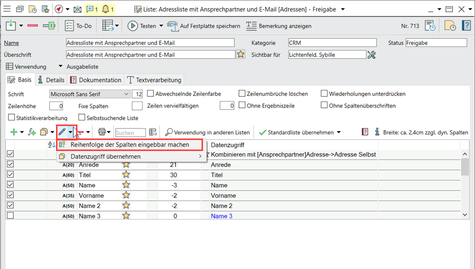 Standardmäßig wird die Reihenfolge der Spalten durch deren Reihenfolge in der Listendefinition vorgegeben.