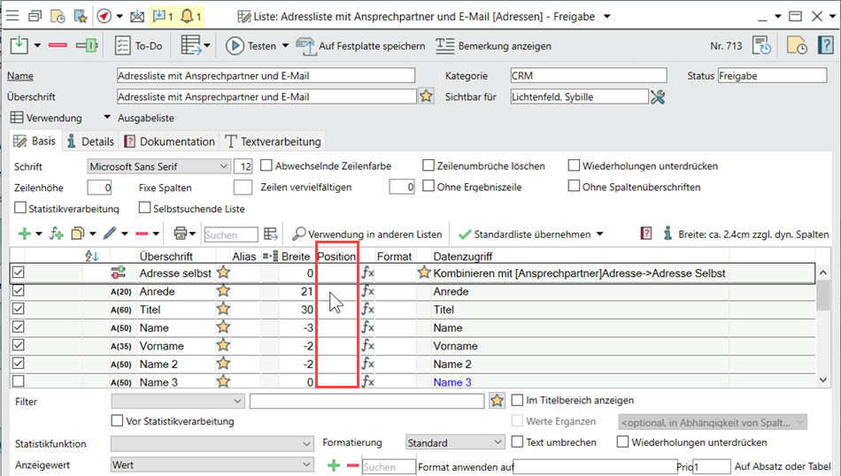 Mit Klick auf Öffnen > Reihenfolge der Spalten eingebbar machen fügen Sie eine neue Positionsspalte ein, in der folgende Werte angegeben werden können: