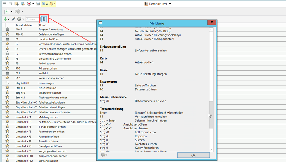 Viele Tastaturkürzel in Bp Event gelten in jedem Kontext, wie F1 zum Öffnen des Handbuchs oder F10 für die Suche nach Adressen. Einige Kürzel werden aber nur in bestimmten Zusammenhängen angeboten und können so auch unterschiedlich belegt sein.