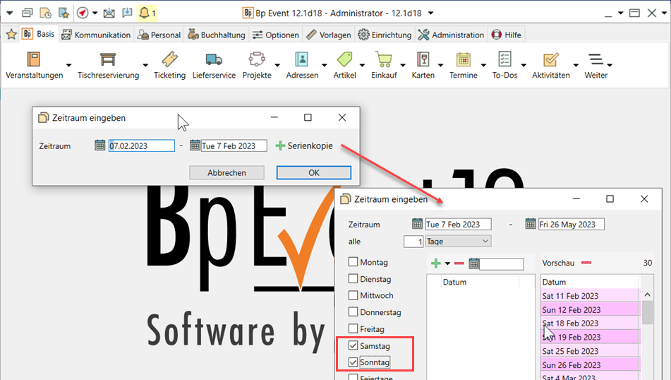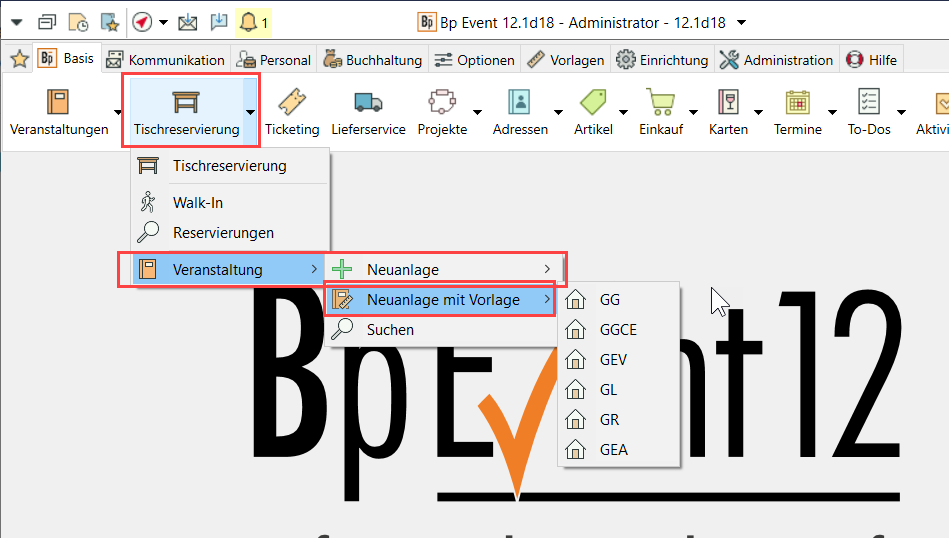 Legen Sie über Basis > Tischreservierung > Veranstaltung > Neuanlage bzw. Neuanlage mit Vorlage neue Tischreservierungsveranstaltungen an.