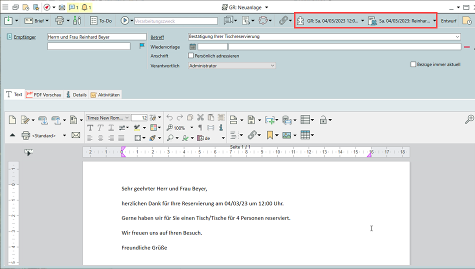 Über das Icon in der Werkzeugleiste legen Sie direkt E-Mails oder Briefe (ggf. auf Basis von Textvorlagen) an, die automatisch mit der Reservierung und der Tischreservierungsveranstaltung verknüpft sind.