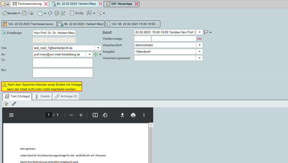 E-Mails und Briefe aus der Tischreservierung anlegen