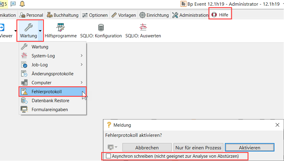Aktivieren Sie zur genauen Analyse von Performanzproblemen (Laufzeit) das Fehlerprotokoll unter Hilfe > Wartung mit der zusätzlichen Option "Asynchron schreiben". Die Option ist ausdrücklich nicht für die Analyse von Abstürzen geeignet.