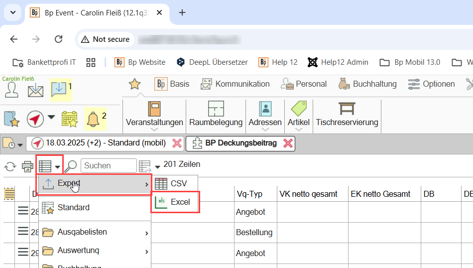 Rufen Sie die Liste auf und klicken Sie auf Export > Excel. Geben Sie dann die erforderlichen Filter an.