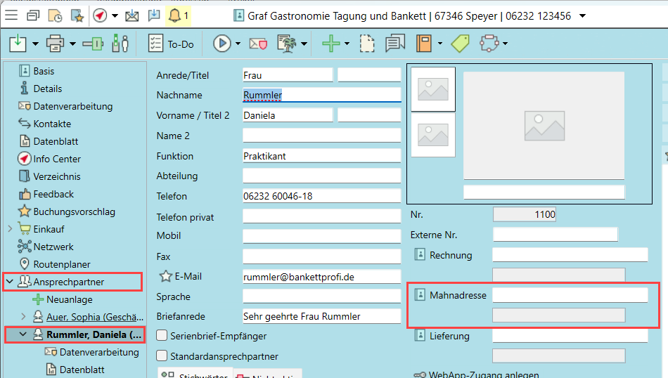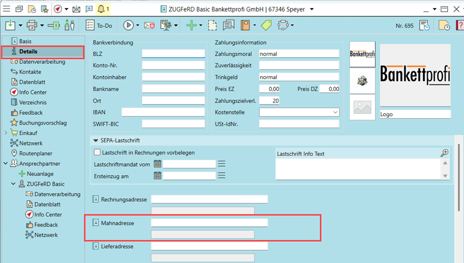 Geben Sie pro Adresse (unter Details) oder Ansprechpartner abweichende Mahnadressen ein. Die Mahnadresse wird automatisch für den Mahnlauf angesprochen.