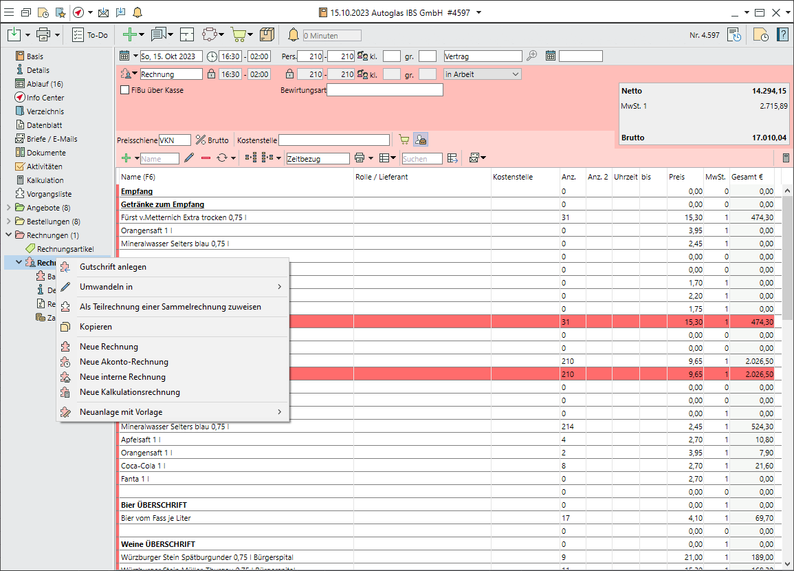 in the toolbar at the bottom of the window to add partial invoices that do not yet have an invoice number and have neither been rejected nor finalised. All partial invoices must have the same invoice address and cost centre and belong to the same company. Invoices created at a later date can be added by context menu (right-click) >