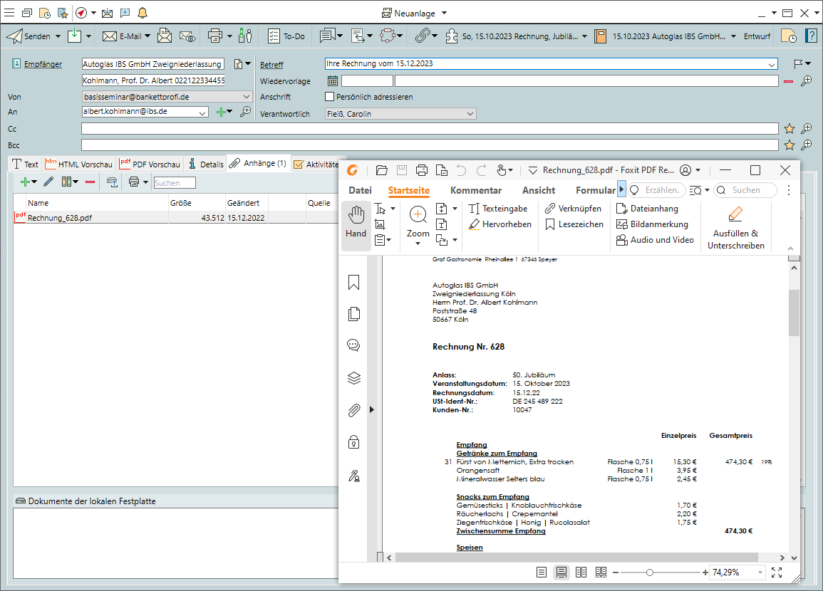 Email as an attachment. An email linked to the selected event, invoice address and the current segment will open