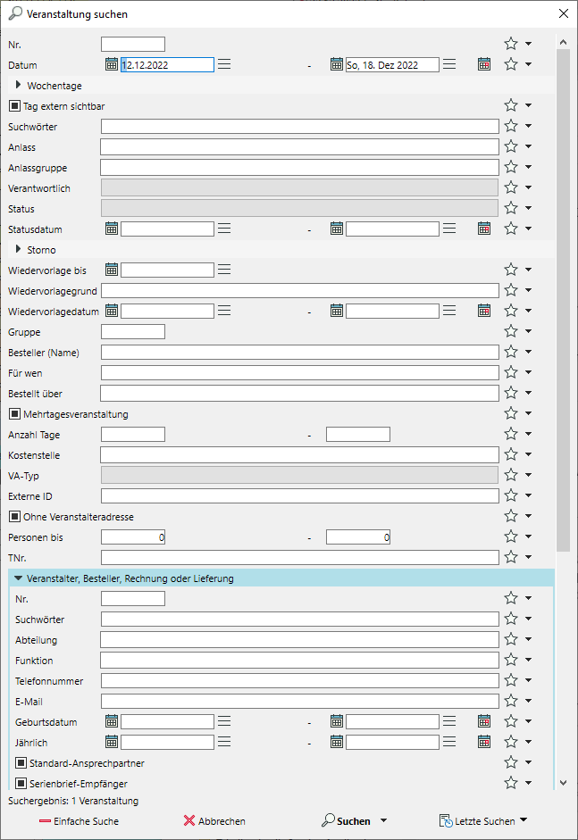 Example: Event status: On hold, Waiting list, Confirmed - Fields that are entered in a combo box (either freely or from an expandable picklist) are also searched. Select a value from the picklist using the down arrow in the input field or enter a free text. Multiple selection is not possible.